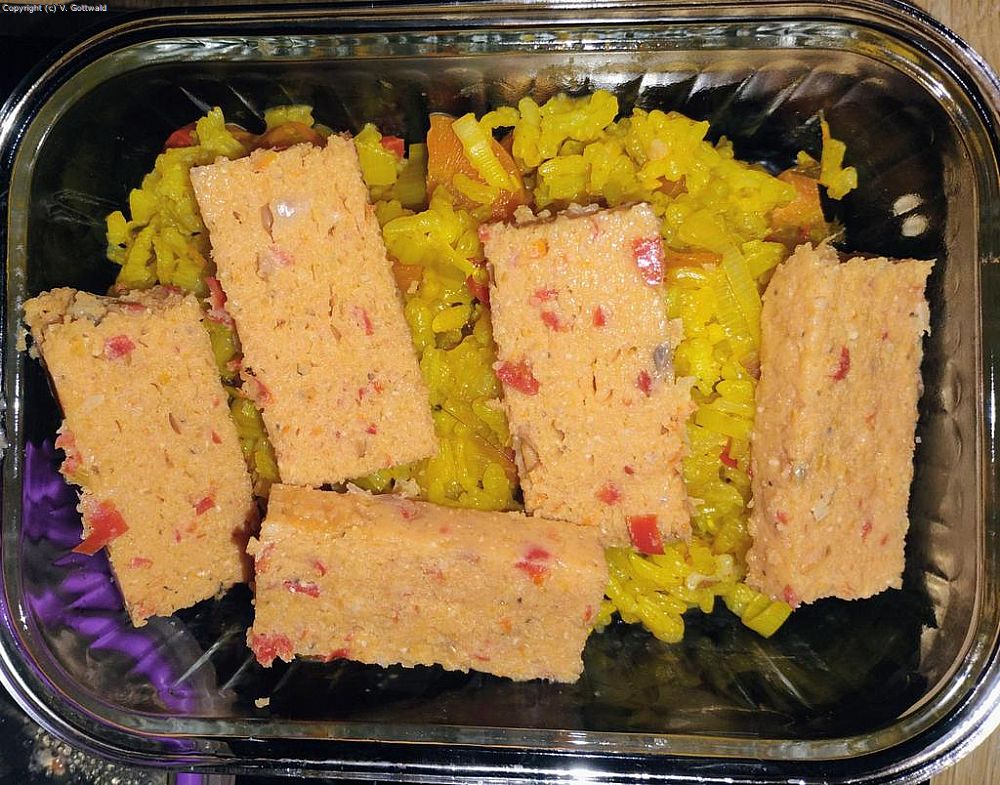 Dann aus der Form lösen und weiterverarbeiten. Ergibt einen schnittfesten, formstabilen Block. Mit unterschiedlicher Formgebung und Würzung sind verschiedeste Varianten möglich.
